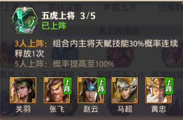 黄忠搭配张飞,刘备,赵云就可以凑齐五虎上将组合,三五虎上将会有30%的概率将天赋技能连续释放一次!